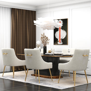 Enhance your decor with SEYNAR chic modern dining chairs set. Featuring soft, skin-friendly velvet cushions and high-density foam. The ergonomic design supports your back, while the silver rear handle allows easy movement. With a sturdy frame and elegant golden metal legs, this chair suits modern and minimalist spaces.