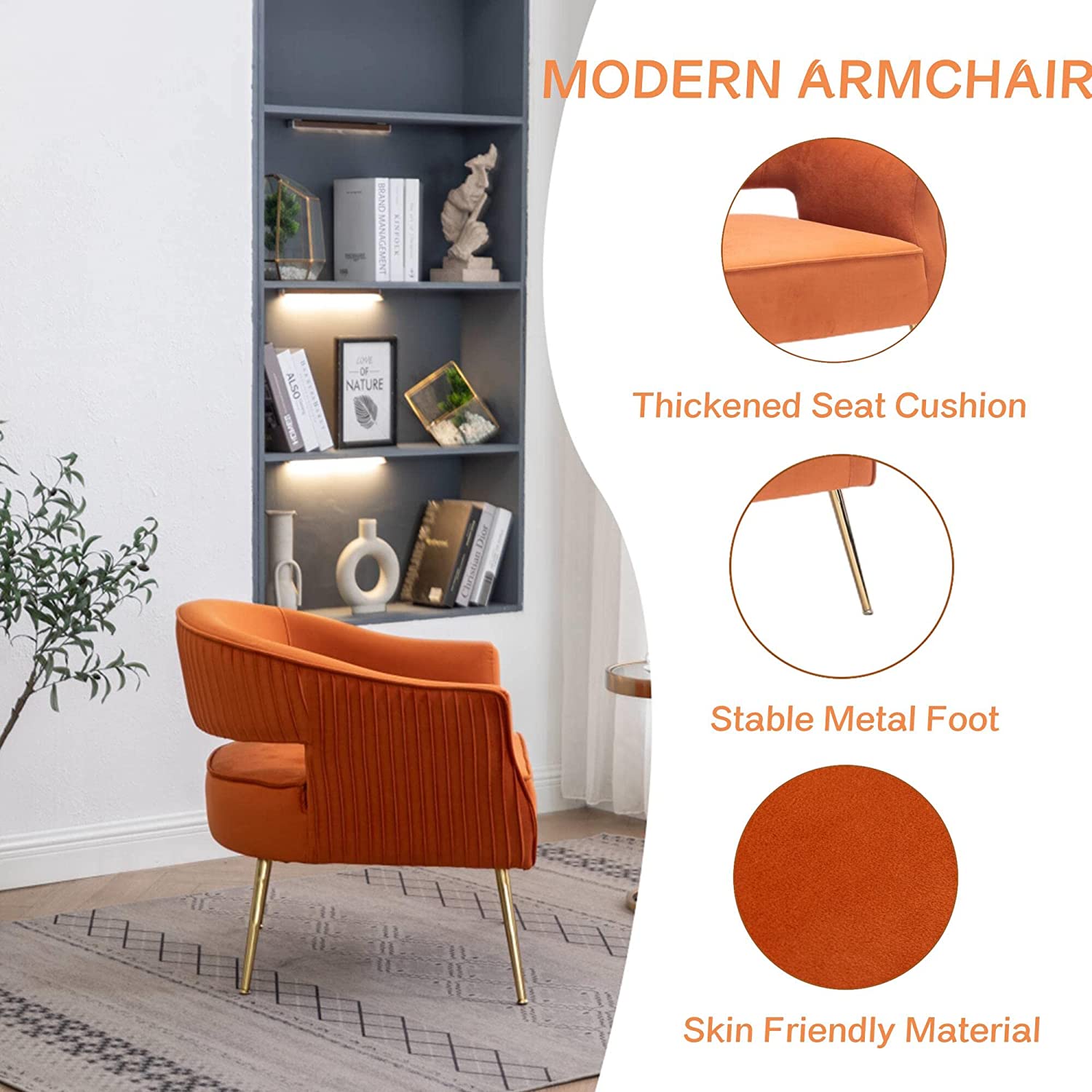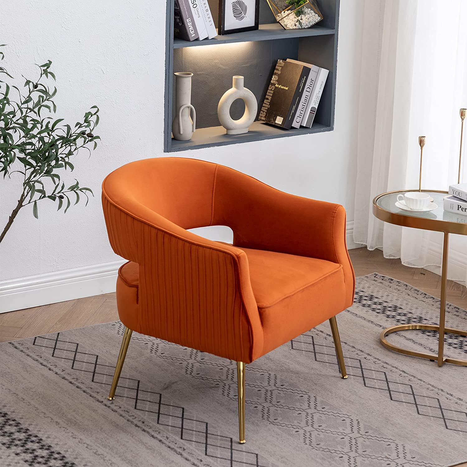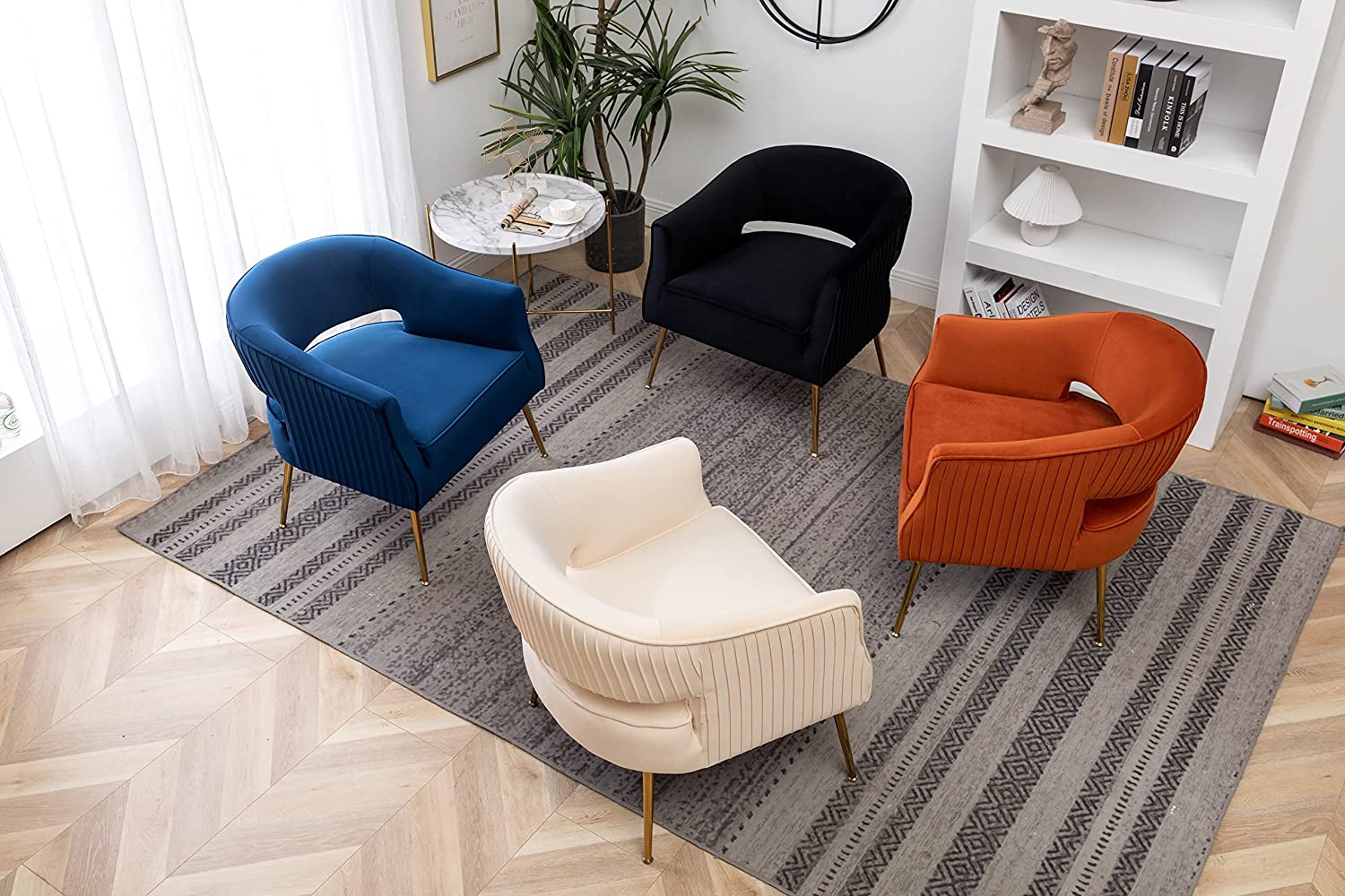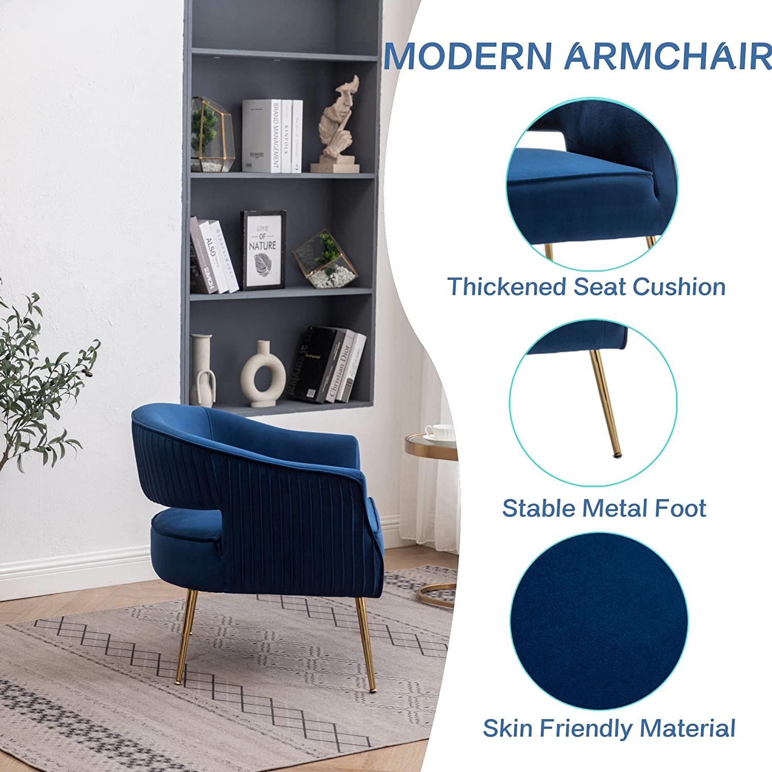 - FLOOR PROTECTION: Each leg is equipped with an anti-slip foot, which makes the accent chair anti-slip and stable, meanwhile protects your floor from scratching and reduces the noise when moving. MULTIPLE USE:The velvet chair has a perfect shape to fit in any environment in your house. It can be used in the dining room, kitchen, living room, bedroom, lounge, as a tea/reading corner chair or as a vanity chair. EASY to SET UP: We will provide you illustrated instructions and numbered parts. Just cross the metal frames and screw them on the seat bottom.